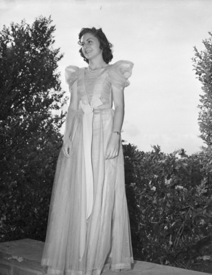 Miss Eldora Spencer is a senior at Diamond Hill High School. She is vice president of her class and secretary of the student body. She is shown standing on a brick partition, wearing a long gown with a bow at the waist and a pearl necklace. Eldora is the daughter of Mr. and Mrs. J. H. Spencer.