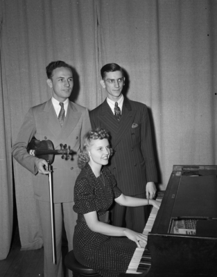 Performing as soloists at the Texas Wesleyan College concert are, left to right, George Henderson, Miss Jane Longmoor, and Osborne Sterley. Mr. Henderson is a violinist. He is dressed in a double breasted suit and has his violin tucked under his right arm. Miss Longmoor is a pianist. She is sitting at a piano, wearing a polka-dot dress. Mr. Sterley is a tenor. He is dressed in a double breasted, pinstripe suit. The concert is under the direction of Marius Thor.