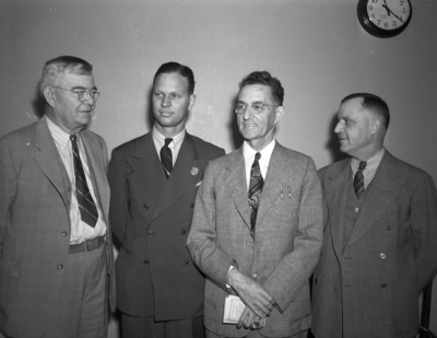Attendees at the Texas Grain and Feed Dealers Association convention included, left to right, Albert Brown, of Lampasas, Texas, W. H. Range, of Beeville, Texas, C. W. Griffin, of Fort Worth, Texas, and A. G. Campbell, of Fort Worth, Texas. Mr. Griffin is the district grain supervisor of the Department of Agriculture. Mr. Campbell is secretary treasurer of the association. All four men are standing against a wall, wearing suits. On the wall, at the upper right, is a clock.