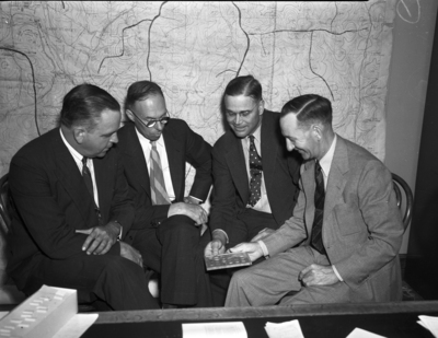 The Grain and Feed Dealers National Association is holding their 43rd annual convention in Fort Worth, Texas. The top grain experts who lectured at the Seed and Grain School are, left to right, R. V. Miller, F. L. Thomas, P. B. Dunkle, and J. F. Shanley. Mr. Miller is head of the seed certification division of the State Department of Agriculture in Austin, Texas. He is dressed in a double breasted pinstripe suit. Mr. Thomas is an entomologist at the Texas Agricultural and Mechanical College experiment station. He is wearing a dark colored suit. Mr. Dunkle works at Texas Substation Number 6 in Denton, Texas. He is dressed in a suit. Mr. Shanley is the chief grain inspector of the San Antonio Grain and Cotton Exchange. He is wearing a light colored suit.