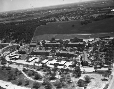 Aerial view of Crestwood Apartments, Fort Worth, Texas's, newest and largest community of apartment homes two miles from downtown on White Settlement Road. The owners feel they are carrying forward the progressive spirit of Fort Worth, Texas, and West Texas. Completion of this community of home apartments was conceived and developed with consideration of the city’s fast growing needs and requirements. The extensive courtyard around which the apartment buildings were constructed provides "individual" lawn space for residents. Buildings are constructed of brick and have tile roofs. Windows of all apartments overlook the courtyard.