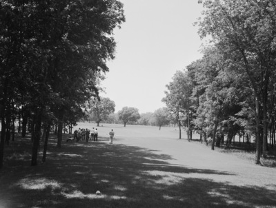 Colonial Hills Golf course and club house. A group of golf players walk through the golf course. Trees on the left and right with a clearing in the middle with the players.