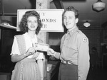 A view of The Fourth War Loan Drive at Fort Worth Quartermaster Depot booth. Shown here are Miss Gloria Cooper who is purchasing the bond from Captain (Capt.) George O. Sokol. Both are jointly holding the bond certificate and smiling. Miss Cooper is an employee in the civilian personnel division. Her purchase is putting the drive over a $100,000 total. She is wearing a collared blouse and a pinafore dress. Captain (Capt.) Sokol is an officer in charge of war bond sales at the Depot. He is dressed in uniform. Published in the Fort Worth Star-Telegram evening edition, February 11, 1944.