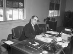 Southwest Rubber Reclaiming Corporation. R. C. Bowen at his desk. Mr. Bowen, president of the Southwest Rubber Reclaiming Corporation, is dressed in a suit. He is writing a note as he sits at his desk and holds a cigar. On his desk is a stack of books and papers, a model train, a calendar, an ashtray and a telephone. There is two windows on the wall behind him. Past his desk are two filing cabinets and a pencil sharpener.