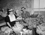 Nine counties are meeting to discuss the 1941 district highway beautification. In connection with the meeting, Cleburne, Texas, is hosting a flower show. Some of the women responsible for the show are, left to right, Mrs. Will F. Lake, of Fort Worth, Texas, Mrs. A. C. Schoppaul, of Cleburne, Texas, and Mrs. E. C. Richards, of Jacksboro, Texas. Mrs. Lake is the district chairman. She is wearing a dark colored dress with a lace-detailed bodice and a hat. Mrs. Schoppaul is the Cleburne chairman. She is wearing a floral print dress. Mrs. Richards is the Jack County chairman. She is wearing a dress, blazer and a hat. The women are examining the flower displays at the show.