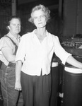 Left to right, Mrs. Henry Goyne and Mrs. May Orr, employees of Firestone Cotton Mills, to donate blood to Red Cross. Both women do more than their share at Firestone Cotton Mills, working overtime and as much as ten hours a day. Mrs. Orr recruits people on her floor of the mill for blood donations. She has twin boys in the Air Force. Mrs. Goyne has nine children. Three of her boys are in the service. Mrs. Goyne is wearing a striped shirt and overalls. Mrs. Orr is wearing trousers and a button-up shirt. They are standing next to machinery.