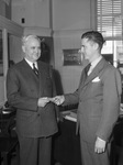 Homer Covey, left, is buying the first block of tickets to the Southwestern Exposition and Fat Stock Show, March 10-19. Making the sale is Dan Gould. Mr. Covey is the president of the Fort Worth Chamber of Commerce. He is wearing a double breasted pinstripe suit. Mr. Gould is president of the Junior Chamber of Commerce. He is dressed in a three piece suit.