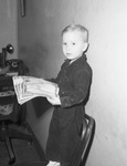 Norman Weldon Blakeley of Springtown, Texas could teach some adults about thrift. The three year old boy is showing the six $25 war bonds he's already accumulated. Norman saved the pennies and nickels he collected from his parents and neighbors to purchase the bonds. His uncle, Private Bill Blakeley serves in the Medical Corps and his father is a war worker at Convair. Norman is standing on a chair wearing a button-up shirt and trousers. There is a telephone on the desk in the background.