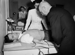 Stanley Gunn, reporter for Star-Telegram, donates a pint of blood at Fort Worth's Red Cross Blood Bank; others not identified, 02/1944