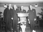 Mathews Memorial Methodist Church Dedication. Left to right, Reverend S. A. Barnes, Reverend Frank P. Culver Senior; Bishop Ivan Lee Holt of Dallas, the speaker, and Reverend Thomas Sterck, pastor. The four men wearing suits are standing behind a pulpit.
