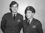 Lieutenant junior grade Clyde Slay Junior, left, and Lieutenant junior grade Jay P. Lowery, two members of the original Hell Divers Squadron recruited in Fort Worth, Texas, in 1942. They are standing in front of a blank wall, both wearing military uniforms. Slay won the Distinguished Flying Cross and holds an Air Medal. Both men are graduates of Paschal High School. Lowery attended the University of Texas and Texas Wesleyan College.