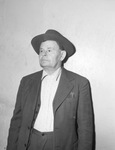 Sixty-six year old L. G. Williams, is sharing stories of his former days as a cow puncher. In 1897, it took a dozen men three months to drive 3,047 steers from the Bartow Ranch near Big Spring, Texas to Fort Mobeetie in the Panhandle. While still a young man, Mr. Williams ditched the cowboy life and went to work for the Texas and Pacific Railroad. He stayed with the railroad for more than thirty years before retiring in 1943. Mr. Williams is standing against a wall dressed in a hat, button-up shirt,vest, blazer, and trousers.