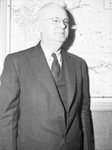 Alex E. Pistole, retired railroad man stands in front of a map of Asia. He is wearing a three-piece suit and eyeglasses.
