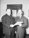 Mayor I. N. McCrary, left, hands to Judge Atwood McDonald a proclamation fixing February 20 to 27 as "Brotherhood Week" in Fort Worth, Texas. Both men are wearing suits and Mayor McCrary is smoking a cigar.