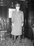 Lieutenant General William S. Knudsen, full length and bust shot. Lt. Gen. Knudsen is wearing his military uniform and a full length coat. He is standing on a rug and in front of a hanging picture of Will Rogers. On the left is a statue of a woman carrying a book and walking with her son.