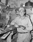 N. E. Norton's hobby began with a request for a hunting knife. He was unable to find a six-inch blade for his soldier nephew, so he gathered broken truck springs from the city garage and started making his first knife. More than a year later, Mr. Norton is in the final stages of knife number 106. He is holding a knife similar to the ones he makes for servicemen. When completed, the oil-tempered knives have an overall length of eight and a half inches, a blade width of two inches and weighs three pounds. Each knife cost Mr. Norton $1.08 to make and four hours of his time. The only payment he receives is a letter from the servicemen when the knife is received. Mr. Norton is standing in his garage. He is wearing a hat, button-up shirt, and trousers.