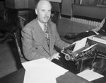 Frank E. Mason is a special assistant to Navy Secretary Frank Knox. The picture was snapped on Thursday when the NBC vice president and former president of the International News Service visited old friends in the Fort Worth Star-Telegram office. Mr. Mason is dressed in a three piece, double breasted suit. He is sitting at his desk, working on a typewriter. There is a dictionary next to him.