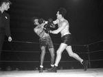 Ralph Laskey, right. Two men shown in the boxing ring, Laskey landing a punch to his opponent's head while the referee looks on. Spectators along the edge of the ring.