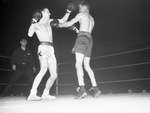 Doyle Albright and Mr. Young. Two men shown in a boxing ring throwing punches while the referee stands behind them. "Doyle Albright & Young Quarter final fight 2/20/44"