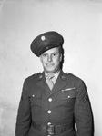 Corporal A. M. Hanson spent his thirty-day furlough in Fort Worth, Texas. He was visiting his wife, who he married on three months before joining the Army. Corporal Hanson will return to Puerto Rico where he runs a parking station for Army planes. He is standing against a wall, dressed in his military uniform.