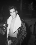 Golden Gloves. Sergeant Manny Ortega. A man standing with a towel around his neck as he smiles. "SGT. MANNY ORTEGA, who won his second straight Texas featherweight championship in the Golden Gloves tournament, displays his trophy. (Star-Telegram Photo.)"