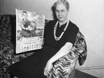 Mrs. Walter Smith, a 60 year old woman was born February 29, 1884. It was however only the fourteenth anniversary of Mrs. Smith's Leap Day birth. But her rare birthday never stopped her from celebrating. She's had a party every year on March 1st except when it was a leap year and February 29 was available. Mrs. Smith is wearing a dress and a necklace. She is sitting on a quilted couch and holding a February 1944 calendar.