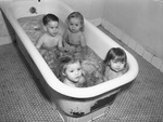 Polio patients at Methodist Hospital. Left to right, Anne White and Jane Foster, front row; Wayne Smith and Glenda Hulme, back row. The four children are sitting a porcelain bathtub. The tub is on a hexagon patterned tile floor.