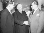 Opening of International Building at Municipal Airport. Mayor McCrary is greeting Carroll F. Hinners, right, and E. P. Hirt, left. Mayor McCrary is wearing a dark three-piece suit and has a cigar in his mouth. Mr. Hinners, the American Airlines traffic manager, is dressed in a light-colored three-piece suit with a handkerchief in the pocket. Mr. Hirt is supervisor of tickets and reservations. He is wearing a dark, double breasted suit. Behind the three men is a photograph of a plane soaring above the clouds.