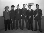 Golden Gloves group leaving from Fort Worth to Chicago. Left to right, Shirley Gaudet of Beaumont; Sergeant Manny Ortega, El Paso; Captain Dick Young, Camp Barkeley; Sergeant Persley Darnell, Fort Worth; Donald Nasche, Fort Worth and Captain James Marlow, Laredo. Army Air Force. A group of men wearing military uniforms . "OFF FOR CHICAGO and the Tournament of Champions are these Texas Golden Glovers, who left here Saturday morning. Left to right: FLYWEIGHT SHIRLEY GAUDET of Beaumont; SGT. MANNY ORTEGA, feather king from El Paso; CORP. DICK YOUNG, Camp Barkeley middleweight; SGT. PRESLEY DARNELL, light heavyweight from the AAFTC attached to Fort Worth AAF; DONALD MASCHE, Fort Worth welter, and CORP. JAMES MARLOW, Laredo AAF lightweight. (Star-Telegram Photo.)"
