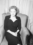 Mrs. O. P. Douglas of Beverly Hills, California, is visiting Fort Worth, Texas with her husband. The couple is registered at the Fort Worth Club while visiting friends and family. They are being entertained at a number of informal affairs. Mrs. Douglas is sitting on a chair, wearing a dark colored dress and a necklace.