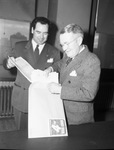 Fourth War Loan Drive. Reverend Hayden Edwards, left, and E. G. Parker are busy on the final day's rush that put Tarrant County over in Series E bond sales. Reverend Edwards is the speakers' vice chairman and church chairman. Mr. Parker is joint vice chairman of the county war finance committee. Both men are wearing suits as the stuff reports in an envelope to the Federal Reserve Bank.