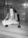 Miss Mary Yates, 23, clerk of Tarrant County District Court. Miss Yates took over the difficult job of being clerk to Judge A.J. Power's busy 96th District Court. It was the first time in twenty-three years that a woman held the post of clerk at one of the four district courts in Tarrant County. Miss Yates has plenty of experience having served as deputy for Claud Wall, clerk of Criminal District Court. Miss Yates is wearing a checked blazer. She is sitting at a desk and there is wood paneling and columns behind her. She is smiling as she writes in a logbook.