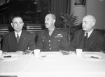 Seated left to right, R. K. Hanger, Brigadier General Thomas O. Hardin and W. L. Stewart, drive chairman, attended the Red Cross War Fund Campaign kick-off luncheon. Mr. Hanger is wearing a pinstripe suit, General Hardin is wearing his military uniform and Mr. Stewart is wearing a solid colored suit. On the table are plates, utensils and cups. Published in the Fort Worth Star-Telegram.