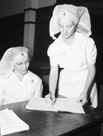 Getting down to work at the new Red Cross Surgical dressing room in the South Fort Worth Elementary School are Mrs. C. A. Willetts, seated, and Mrs. Hubert Smith. They are among the twelve people registering for the first meeting. Both women are dressed in their nurse uniforms. Mrs. Smith is writing her name on the sign-up log.