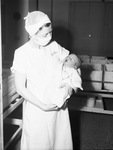 Nurse Louis White holding first Leap Year baby of 1944. He is the son of Mr. and Mrs. Homer Mills. Mr. Mills, third-class petty officer is serving overseas with the Navy. Baby Boy Mills was born at 4:34 a.m. at Harris Memorial Methodist Hospital. Nurse White is wearing scrubs and a surgical mask. Baby Mills is wrapped in a blanket as he sleeps.