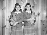 The Birdville Red Cross auction is set to take place on Friday. Wanda Long, left, and Rita Fay Long, are holding a pair of chickens that are to be auctioned. The girls are wearing matching outfits consisting of a collared blouse, a checkered blazer, and a plaid skirt. There is a sign in the background that reads "lets give!".