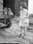 Wanda Fay Neel, five, was bitten by one of the dogs suspected of rabies infection. She was an interested spectator in the Thursday roundup of stray dogs in the Wiesenberger Addition. She is wearing a patterned dress, and standing with her hands in her pockets.