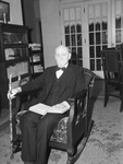 Doctor H. M. Longino of Mineral Wells, Texas is preparing to celebrate his 100th birthday. He is sitting on a rocking chair reading his favorite book, a New Testament. Doctor Longino is dressed in a three piece, double breasted suit with a bowtie. He is holding a cane in his right hand. There is a bookcase and a door along the back wall.