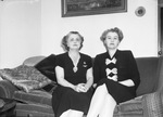 Sisters Mrs. Don Thompson, left, and Mrs. Ken Reid are visiting their parents, Mr. and Mrs. N. H. Lassiter, in Fort Worth, Texas. Mrs. Thompson, the former Miss Helen Lassiter, made the trip from her home in El Paso, Texas. She is wearing a dark dress with a brooch and military pins. Mrs. Ken Reid, the former Miss Henry Lassiter, is visiting from Evanston, Illinois. She is wearing a long-sleeve dress with lace bows down the front. The sisters are staying at the Hotel Texas while in town.