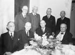 The original members of the Medical Society, formed in 1905, were in Fort Worth, Texas for a reunion. They are seated, left to right, Doctor W. C. Lackey, Doctor W. G. Cook, Doctor Kent V. Kibbie and Doctor J. A. Kelley; standing, left to right, Doctor Charles H. Harris, Doctor Thomas M. Jeter, Doctor J. D. Covert and Doctor John M. Furman. They were guests of Doctor Harris for a dinner Friday Night at Harris Memorial Methodist Hospital. 4 men are sitting at a table and the other 4 men are standing behind them. There is a flower arrangement on the table.