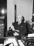 Reverend James K. Thompson is retiring after twenty-five years with the First Presbyterian Church. He turned seventy years old in January. Since Reverend Thompson took over as minister, the church has increased one-third in membership. He is a member of the City Solicitation Committee and the Masonic Orders. Reverend Thompson is sitting at his desk, reading from a worn Bible. He is dressed in a three piece suit. His desk is cover in papers, books, and a typewriter.
