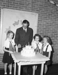 Joan Hewatt, left, Patricia Ann Marshal and Diane Bourland look on while Bryant Nowlin, second from left, lights the birthday cake at the party celebrating the 32nd anniversary of Camp Fire Girls. The cake is placed on a square table. Mr. Nowlin is wearing a suit and the girls are wearing their Camp Fire Girls Bluebirds uniforms.
