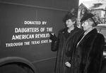 Daughters of the American Revolution. Mrs. Samuel J. Campbell, Mount Carroll, III, and Mrs. Julius Y. Talmadge, Athens, Ga., looking at bloodmobile donated by Daughters of the American Revolution. Two women standing next to a bloodmobile as one points at the wording on the side.