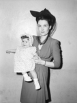 Mrs. Arthur S. Huey and daughter Charlsie Huey, of Billings, Montana, are visiting Mrs. Huey's parents, Mr. and Mrs. V. S. Brunson, of 2001 Avenue C, Fort Worth, Texas. Mrs. Huey is holding her baby daughter. Mrs. Huey is wearing a hat and dress. Charlsie is wearing a dress with a bonnet. Mrs. Huey is holding on to her daughter's left hand. Star-Telegram Morning March 12, 1944