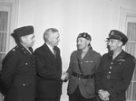 Lieutenant Colonel H. A. Pollack of the Royal Scots Fusiliers, is being greeted in Fort Worth, Texas. He has reviewed Texas Guardsmen on a 2,000 mile tour that took him to Austin, San Antonio, the Rio Grande Valley, Houston, Beaumont, and Dallas. Pictured left to right are Lieutenant Colonel George D. Thomas, Major Marshall Kennady, and Colonel Pollock. An unidentified man is standing at the far right. Colonel Pollack is standing in an at ease position, wearing his military uniform. Major Kennady is dressed in a double breasted suit. He and Colonel Pollock are shaking hands. Colonel Pollock is wearing his Scottish military uniform.