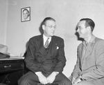 When Bill Wood, right, operator of Bill Wood Photo Company, 1209 Throckmorton, enters service Friday, his father, Will S. Wood, will take over his photographic work and the firm going until his son returns. The father, who has been sales and advertising manager for Renfro Drug Company, has resigned his job to enter his son's business and will continue in it after the war. The two men are sitting down conversing next to a desk. There is a photograph of a man hung on the wall.