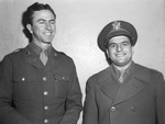 Sergeant Kriss Cross, left and Lieutenant Frank Manente arrived in Fort Worth, Texas from Majors Field in Greenville, Texas. They are enlisting aide from local women to form the first Air Women's Army Corps detachment to the 5th Ferrying Group at Love Field in Dallas, Texas. The men are standing against a wall, dressed in their military uniforms.