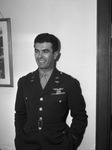 Captain Charles B. Covert is a bomber pilot in the United States Army. The former Fort Worth, Texas resident is stationed in his home town at the Army Air Field Training Command Headquarters. Captain Covert spent eight months overseas. He piloted a B-17 known as "Cotton Eye Joe" on fifty missions, earning an Air Medal and nine Oak Leaf Clusters. Captain Covert graduated from old Central High School in 1932, then attended North Texas Agricultural College (NTAC) and North Texas State Teachers College (NTSTC). He entered the Army in 1940 and married Miss Maxine Kruger, of San Antonio, Texas two years later. The couple has one son, Charles Junior. Captain Covert is standing against a wall, wearing his military uniform. There is a painting hanging behind his right shoulder.