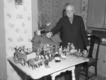 L. P. Street, 83, shown with pioneer scene and figures that he made. L. P. Street is standing next to a table full of wooden figures that he created. Image appeared in the Star-Telegram Sunday March 12, 1944.