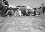 Cowhands from around the nation were in Fort Worth, Texas, for the gala opening of Southwestern Exposition and Fat Stock Show. They are, left to right, Herb Dahl, Jack Skipworth, of Clovis, New Mexico, Eddie Hovenkamp, of Fort Worth, Texas, and George Mills, of Montrose, Colorado. The four men are lying on their stomachs on the grass. There are several horses and a car behind them. They are wearing cowboy hats and western apparel.